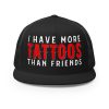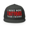 Snygg keps med texten ’I have more tattoos than friends’ som tryck på framsidan. Kepsen är i snapback-modell och finns i fyra olika färger. Passar alla oss som har fler tatueringar än vänner.