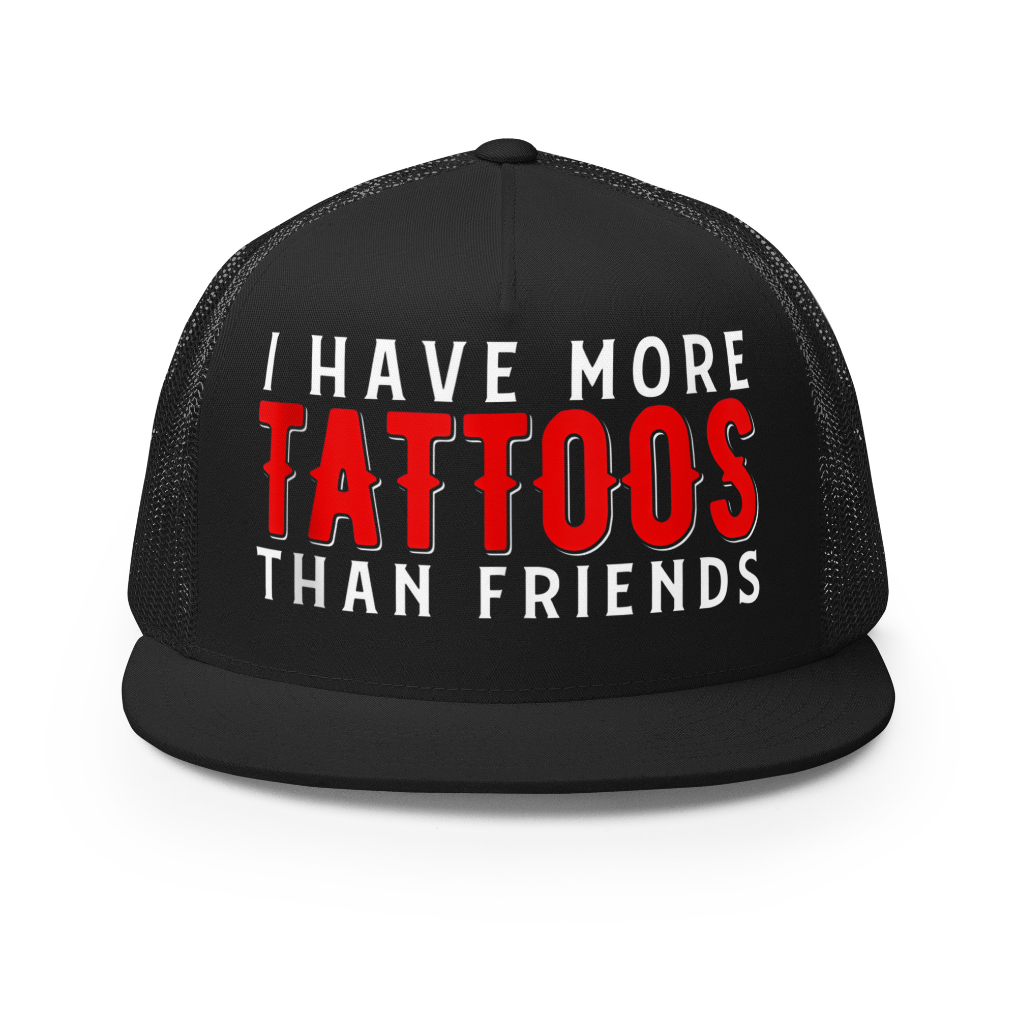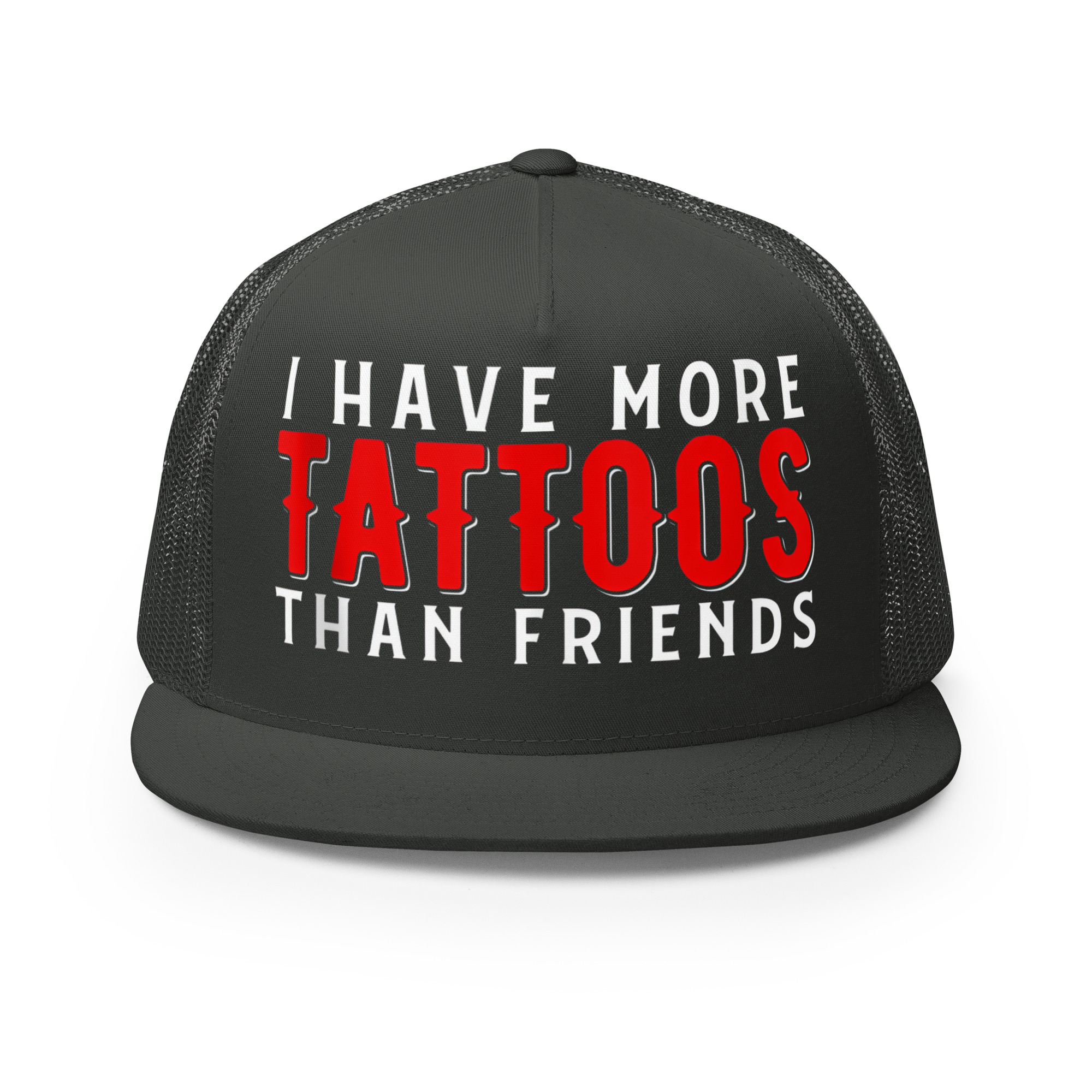 Snygg keps i snapback-modell med texten ’I have more tattoos than friends’ som dekoration på framsidan. Kepsen finns i fyra olika färger och passar perfekt till både män och kvinnor. Passar huvuden med en omkrets på 53,3-58,4 cm.
