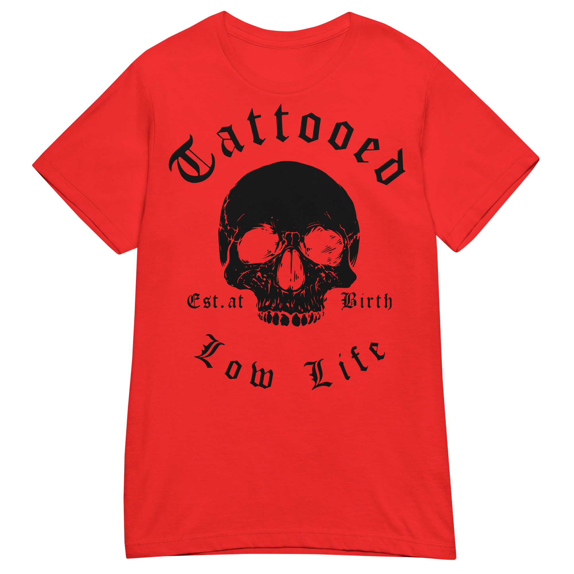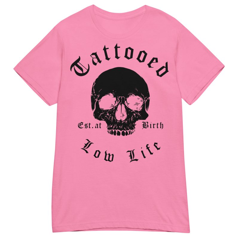 Semi-fitted t-shirt dekorerad med en stor dödskalle och texten ’Tattooed low life’ som dekoration på framsidan. Passar alla kvinnliga tatuerade low lifes. Du kan välja mellan fem olika färger.