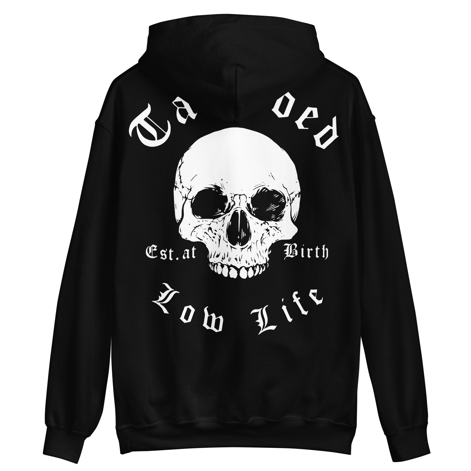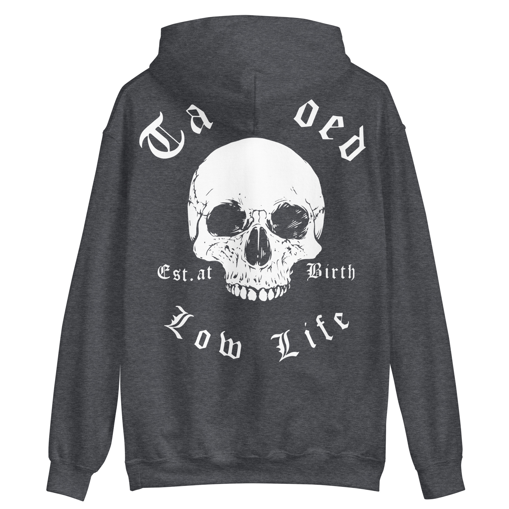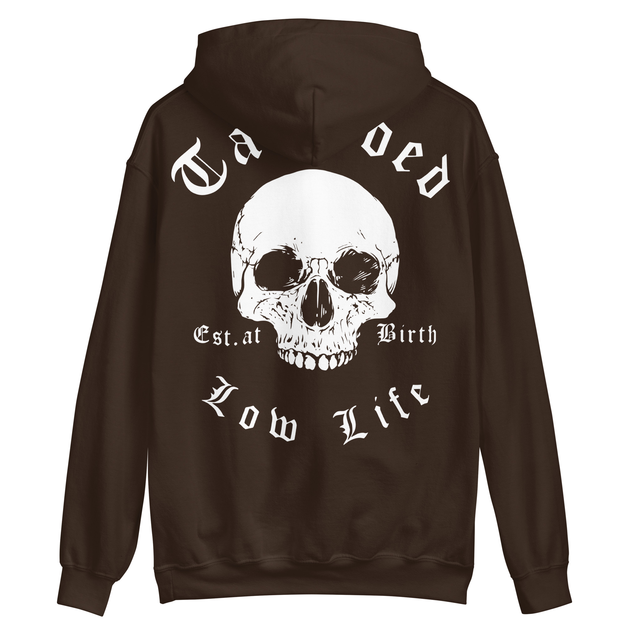 Varm och skön hoodie dekorerad med en stor dödskalle och texten ’Tattooed low life’ som ryggtryck. Tröjan är tillverkad i blandad bomull/polyester och finns i nio olika färger. Passar alla manliga och kvinnliga tatuerade low lifes.