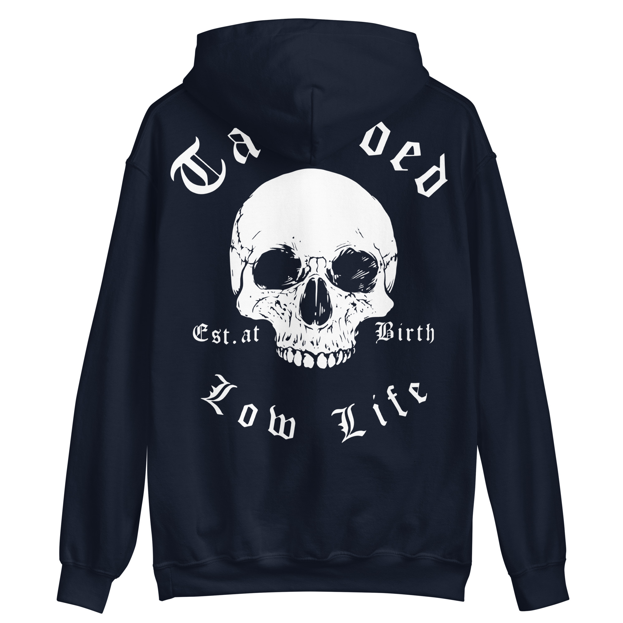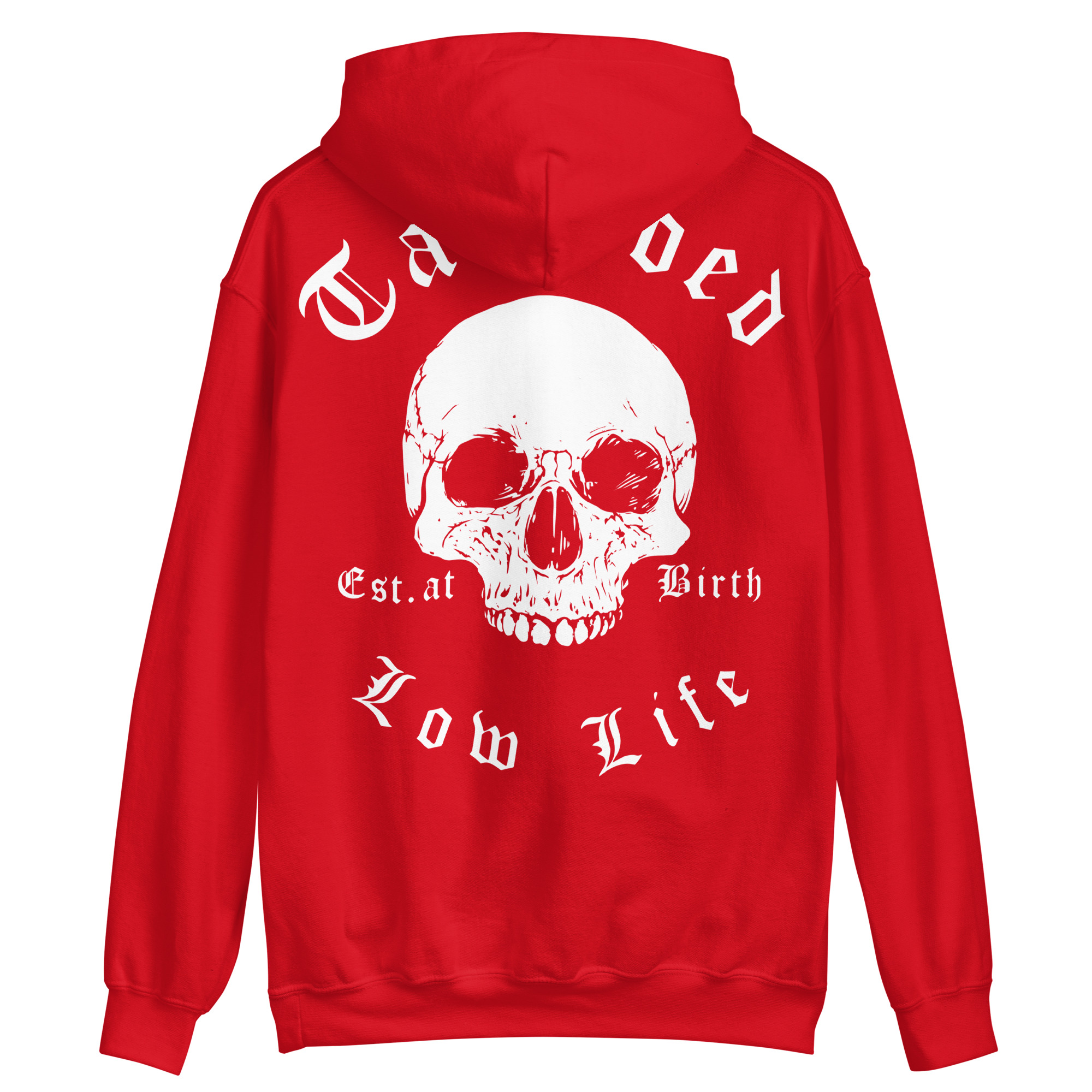 Snygg hoodie med en stor dödskalle och texten ’Tattooed low life’ som ryggtryck. Passar alla manliga och kvinnliga tatuerade low lifes. Välj mellan nio olika färger.