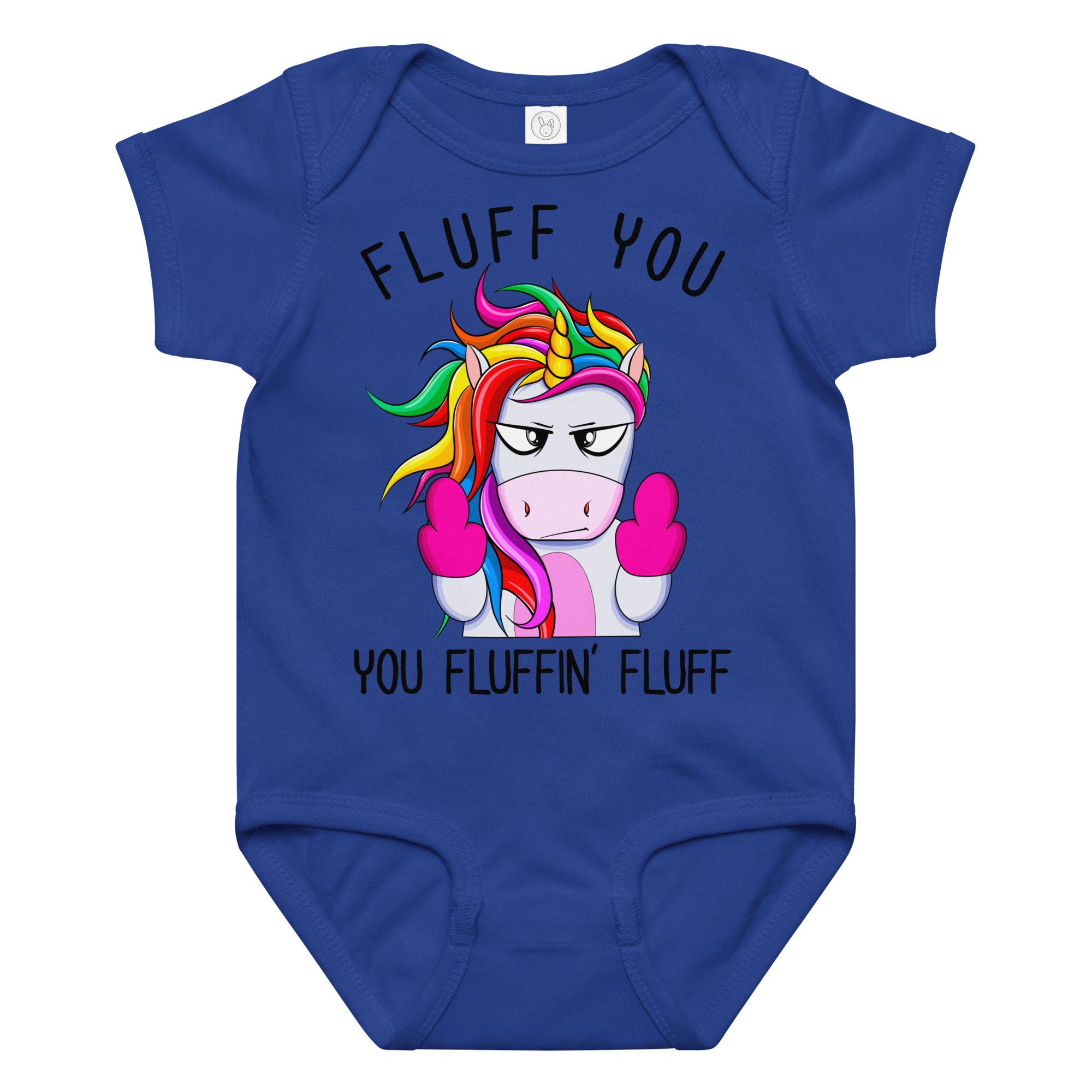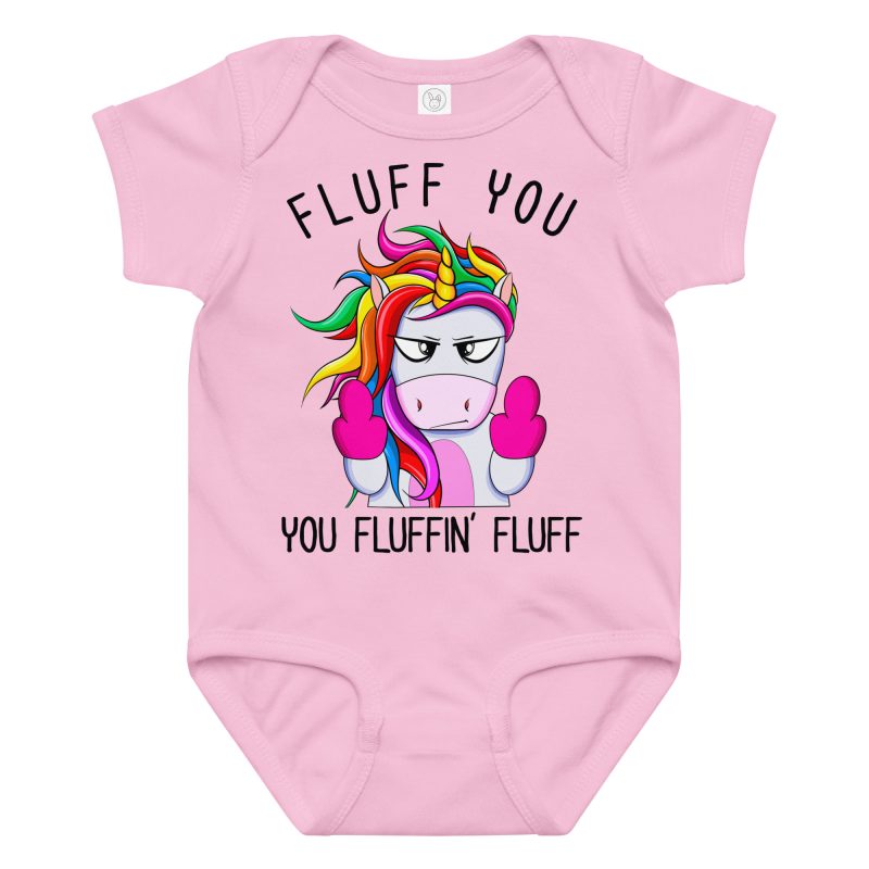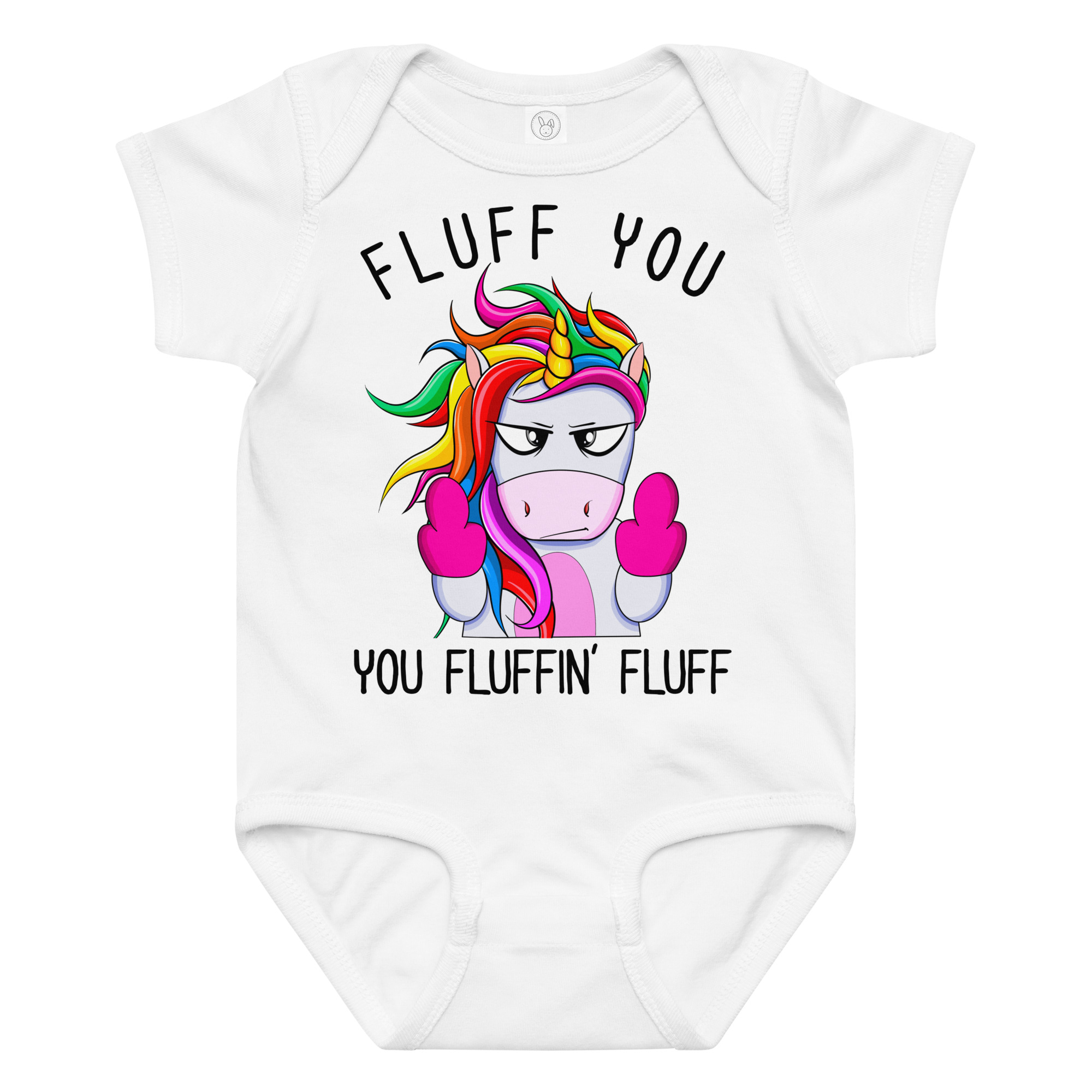 Söt baby body med en enhörning som visar långfingrarna och texten ’Fluff you, you fluffin’ fluff’ som tryck på framsidan. Bodien passar alla bebisar med attityd. Välj mellan fyra olika färger.
