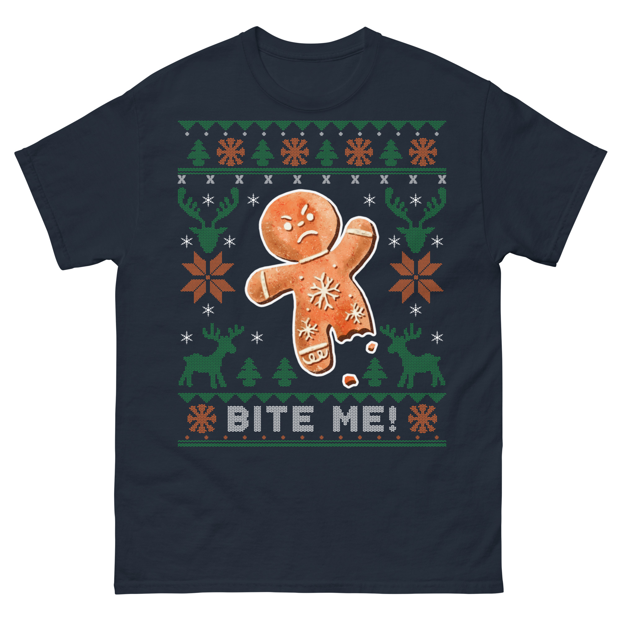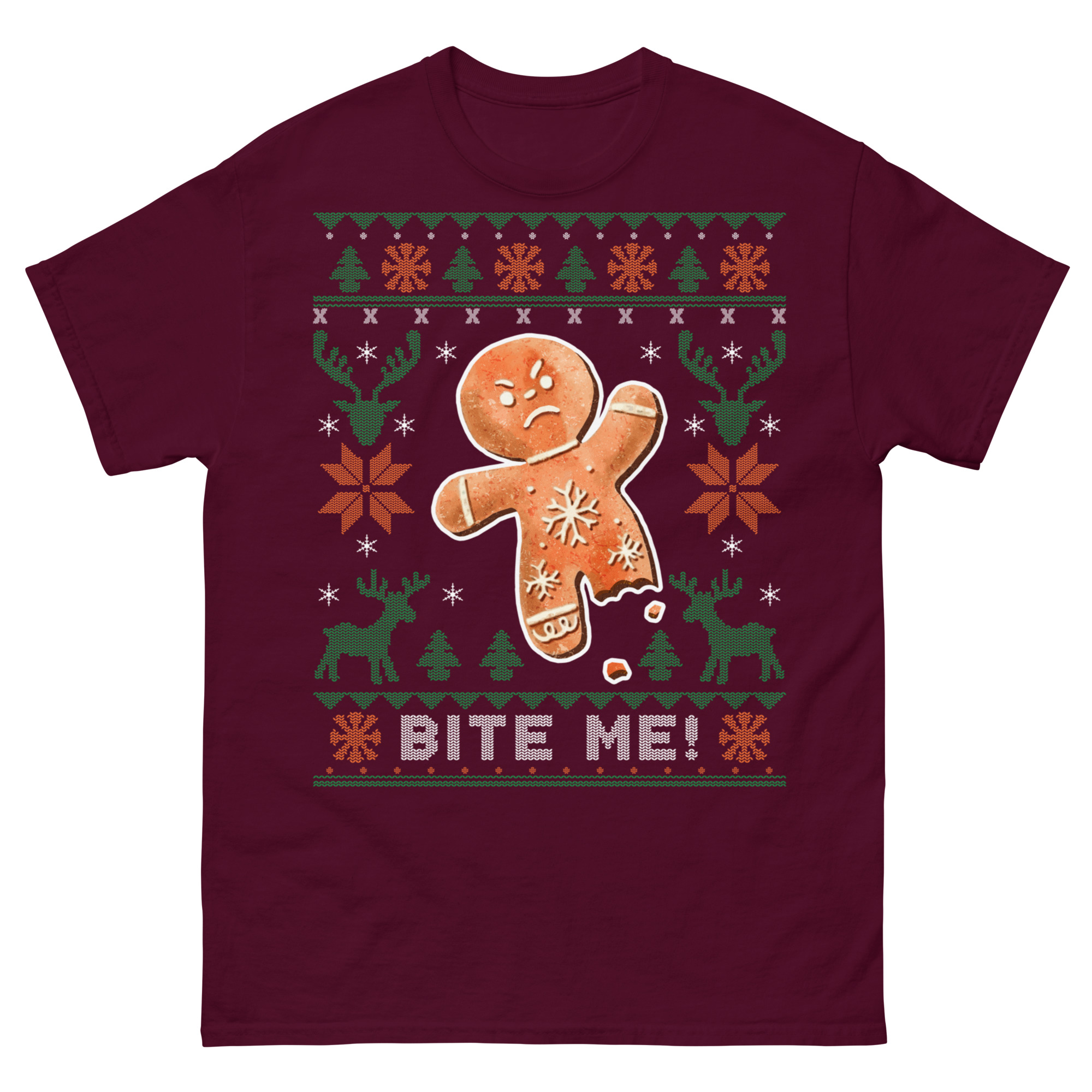 T-shirt dekorerad med ett stort julmotiv med en pepparkaksgubbe som saknar ena foten och texten ’Bite me!’ som dekoration på framsidan. Passar alla män och kvinnor som älskar udda jultröjor. Du kan välja mellan tre olika färger.