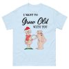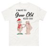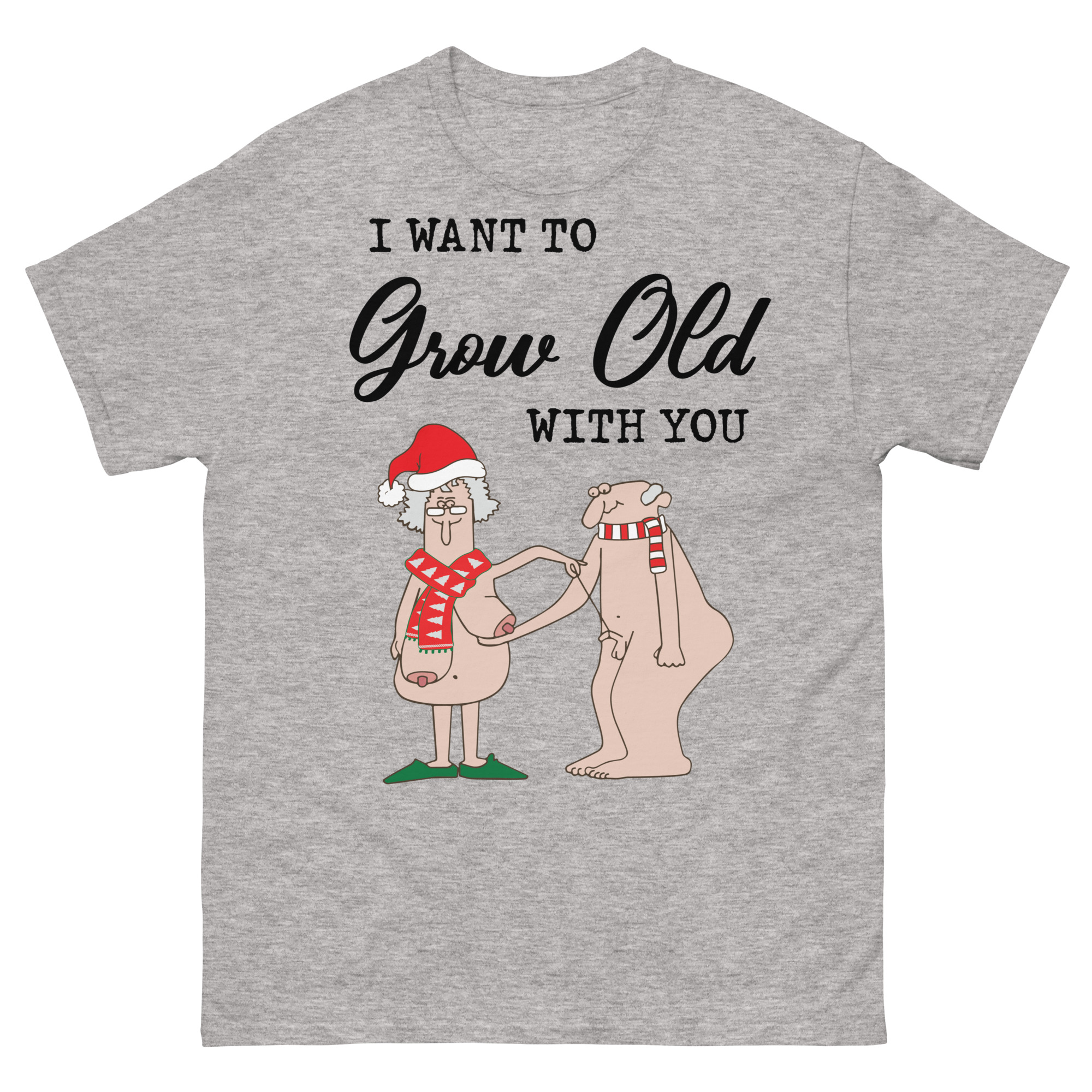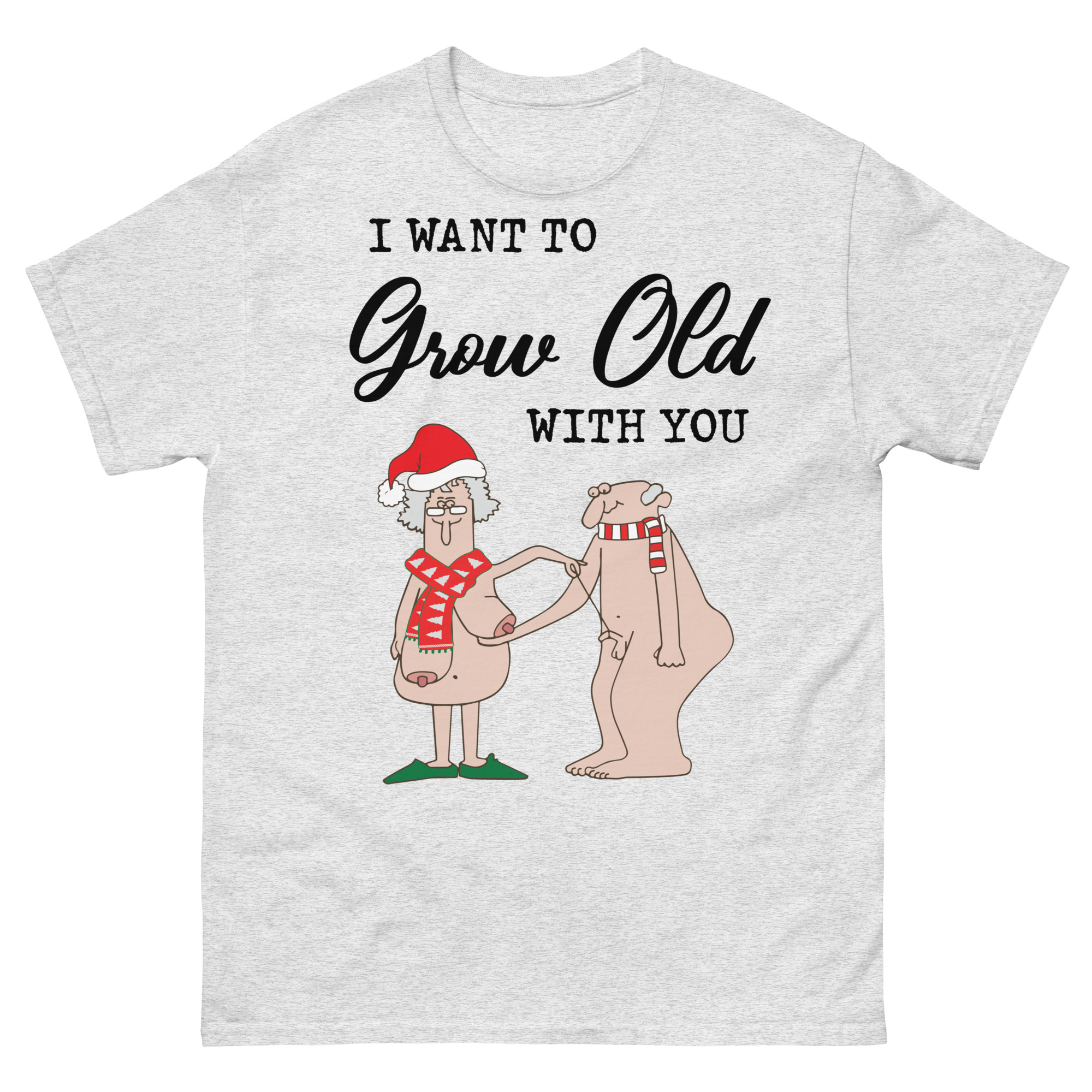 Jultröja med korta ärmar med ett stort julmotiv med två äldre nakna människor som hjälper varandra och texten ’I want to grow old with you’ på framsidan. Passar perfekt som julklapp till personen du vill bli gammal med. Välj mellan fyra olika färger.