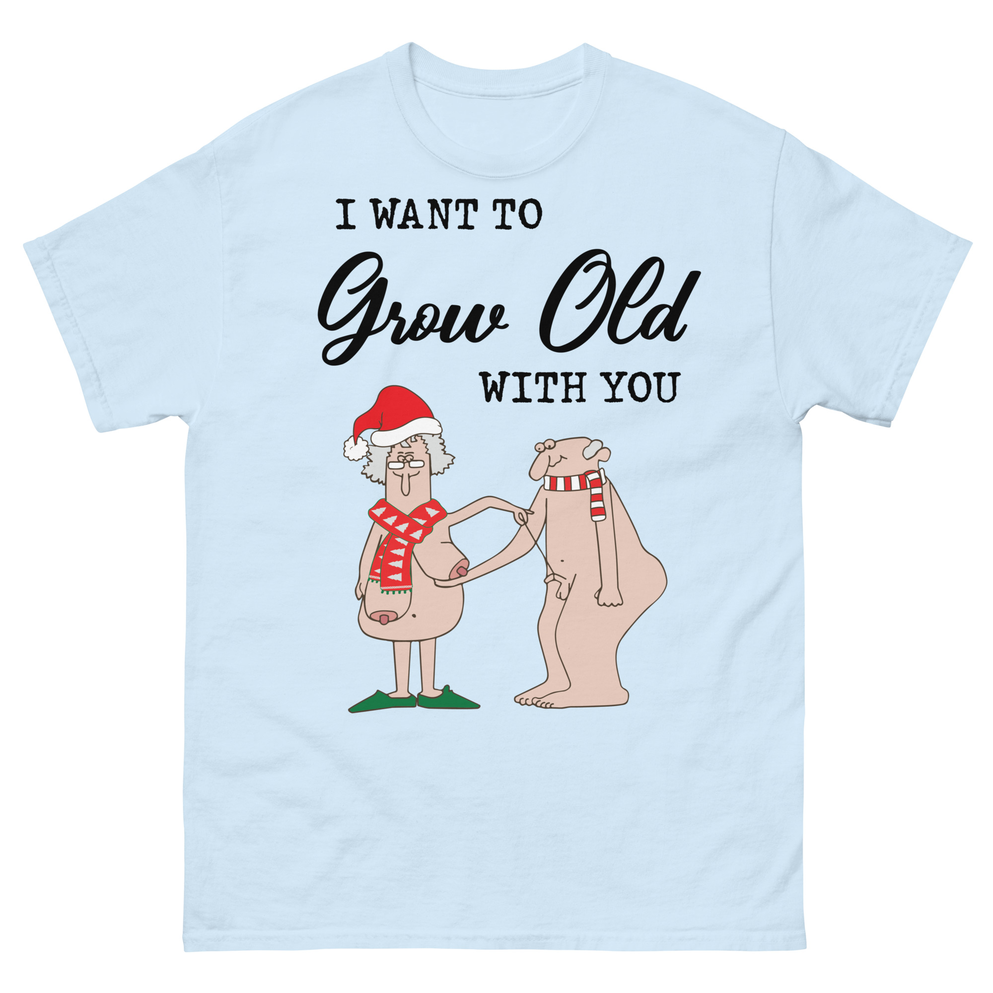 T-shirt dekorerad med ett stort julmotiv med två äldre nakna människor som hjälper varandra och texten ’I want to grow old with you’ som dekoration på framsidan. Passar alla män och kvinnor som älskar udda jultröjor. Du kan välja mellan fyra olika färger.