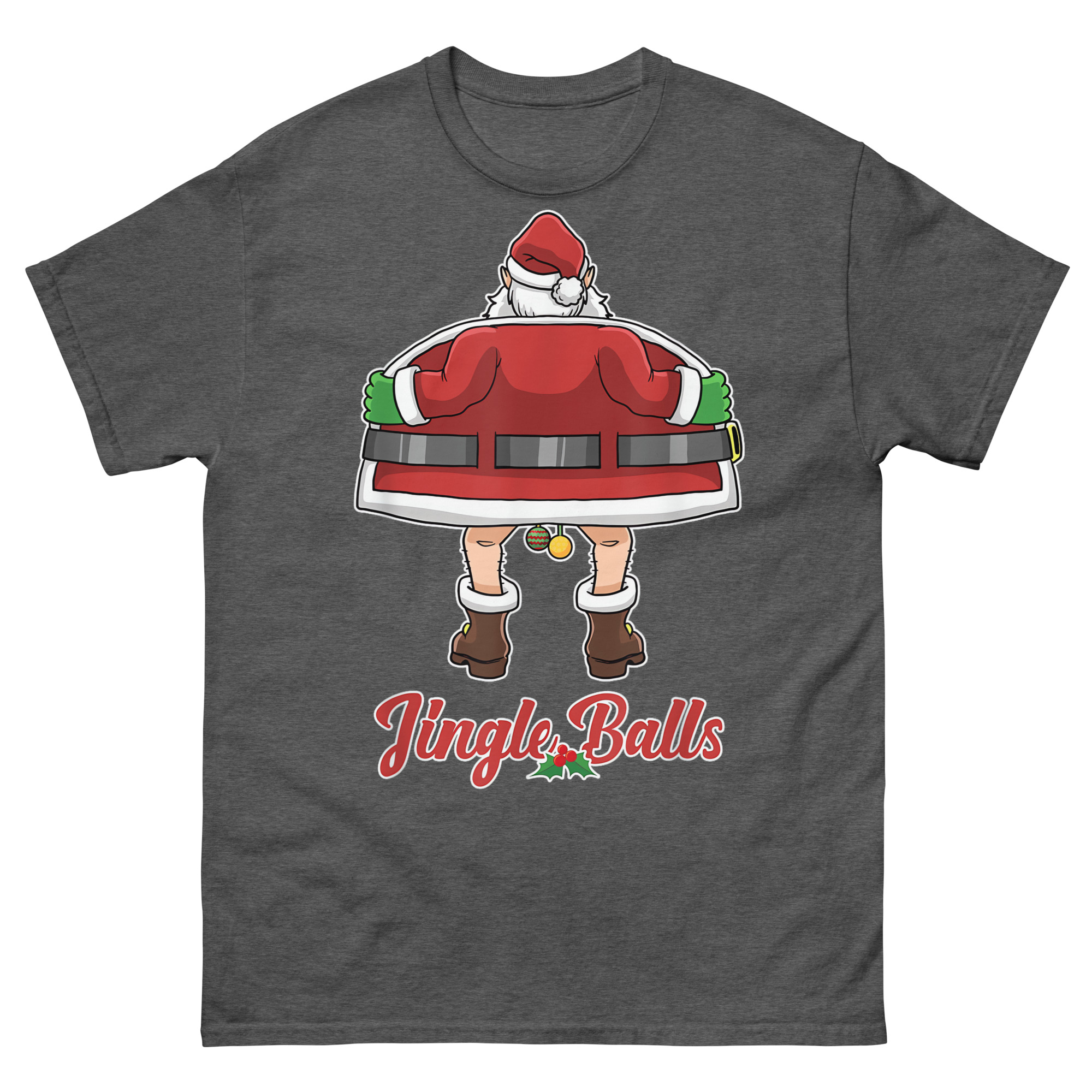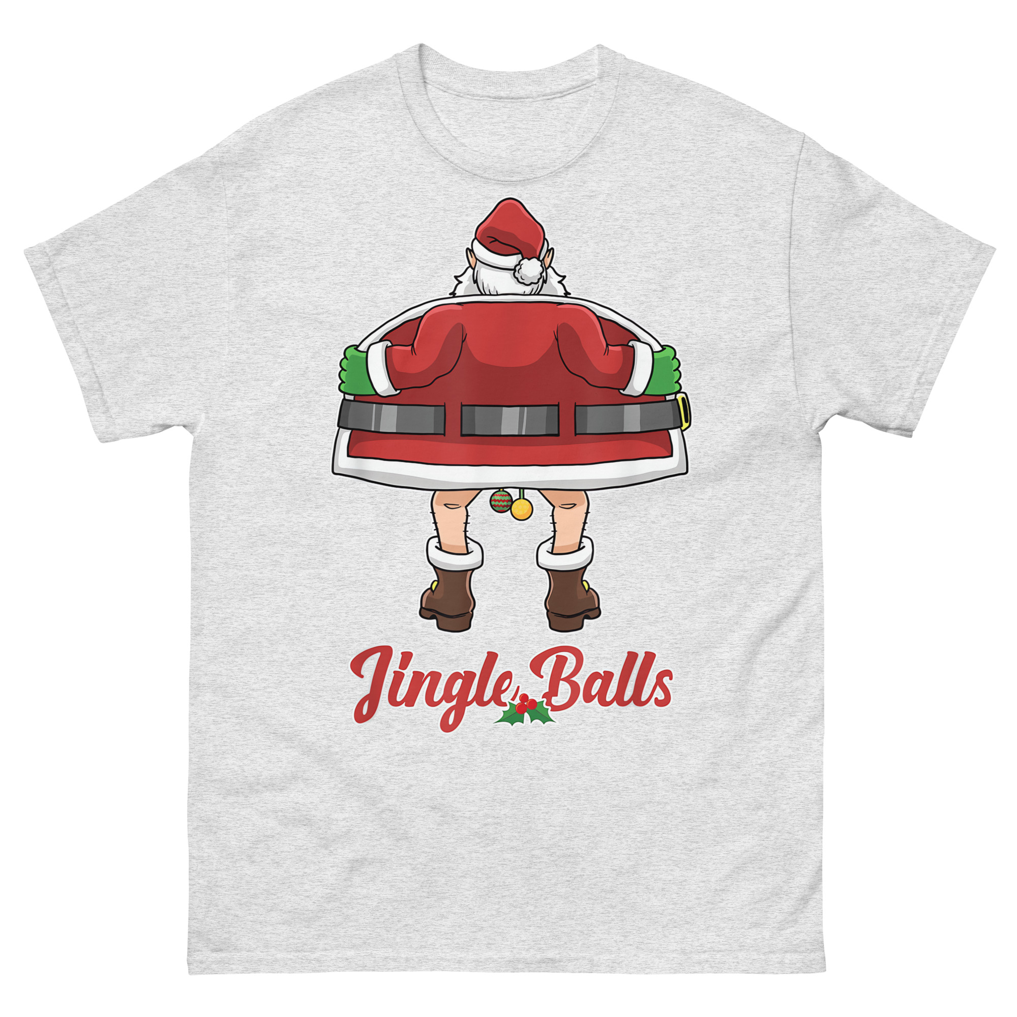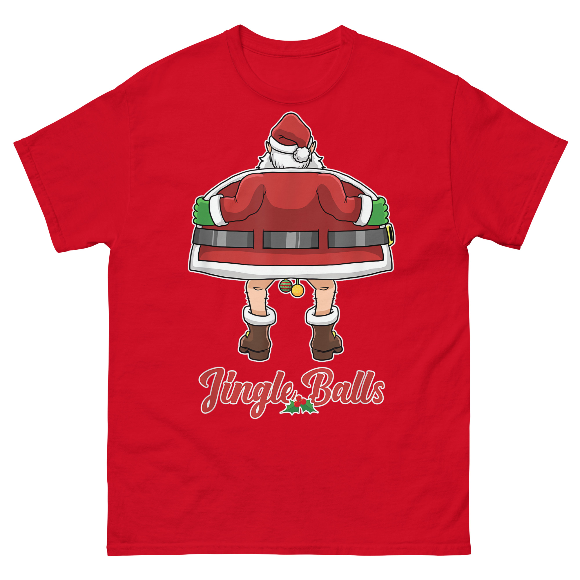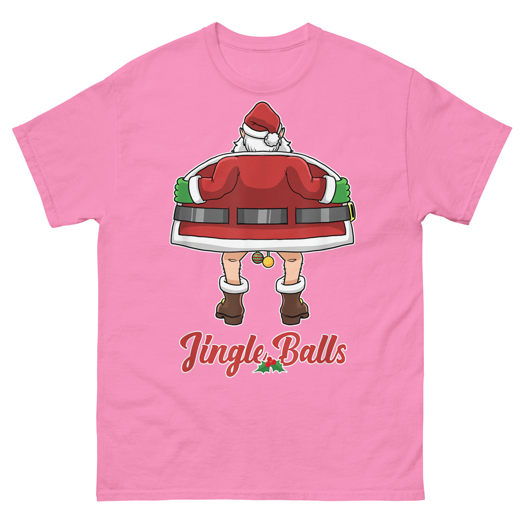 T-shirt dekorerad med ett stort julmotiv med en jultomte som visar kulorna och texten ’Jingle balls’ som dekoration på framsidan. Passar alla män och kvinnor som älskar udda jultröjor. Du kan välja mellan 13 olika färger.