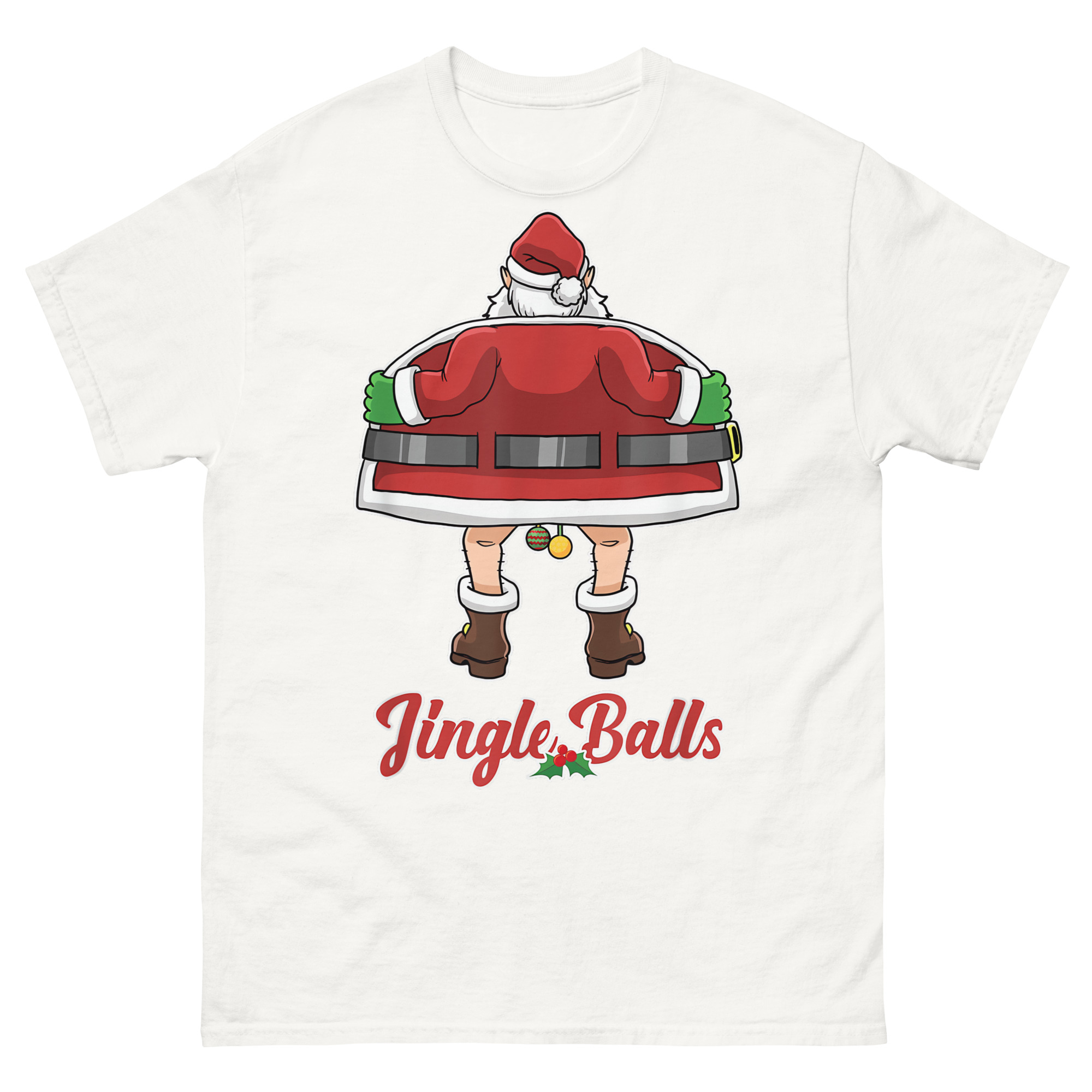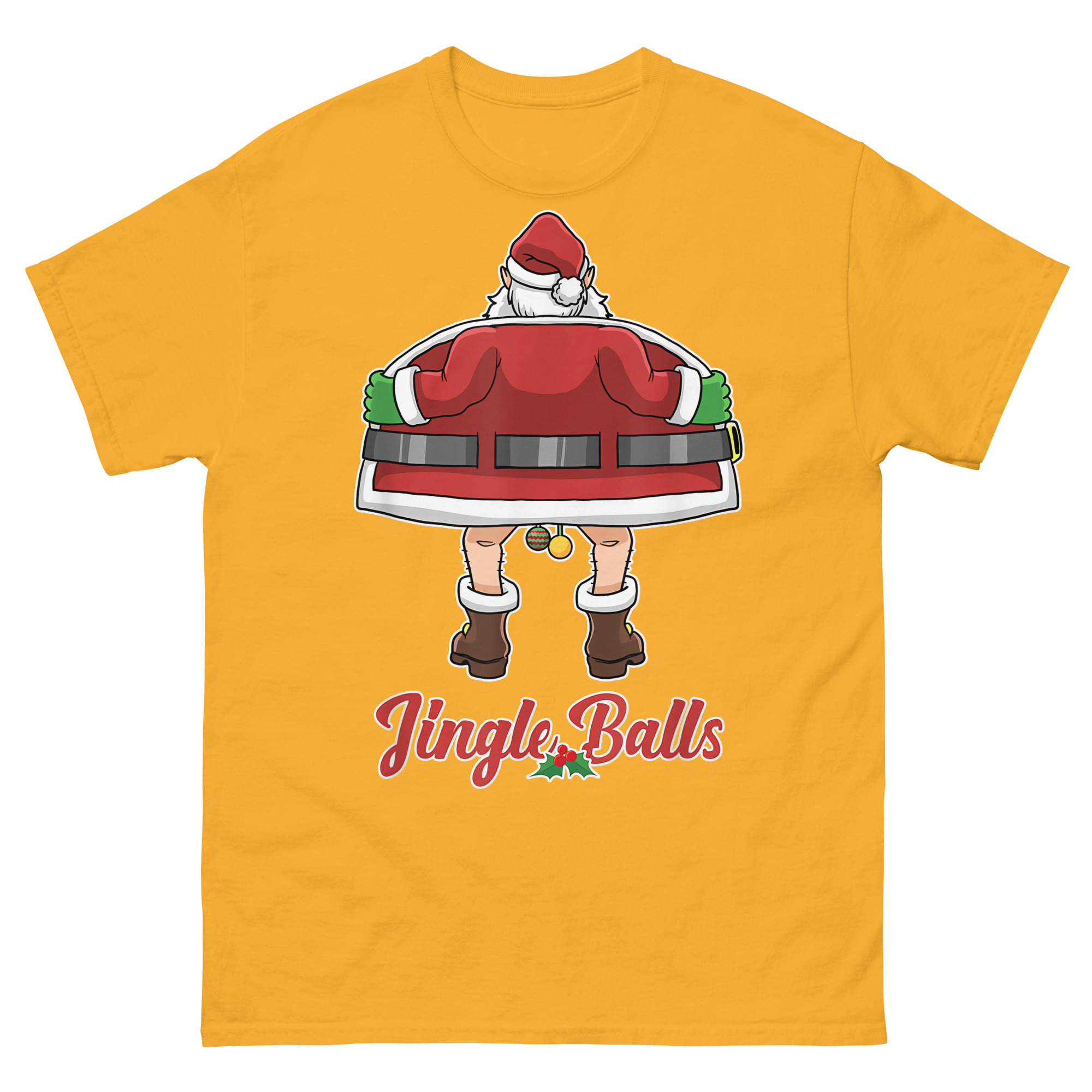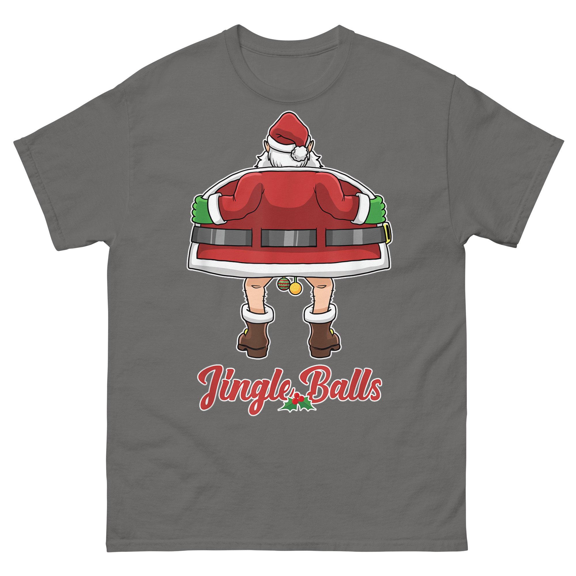 T-shirt dekorerad med ett stort julmotiv med en jultomte som visar kulorna och texten ’Jingle balls’ som dekoration på framsidan. Passar alla män och kvinnor som älskar udda jultröjor. Du kan välja mellan 13 olika färger.