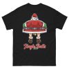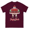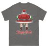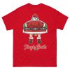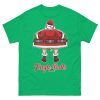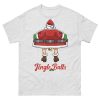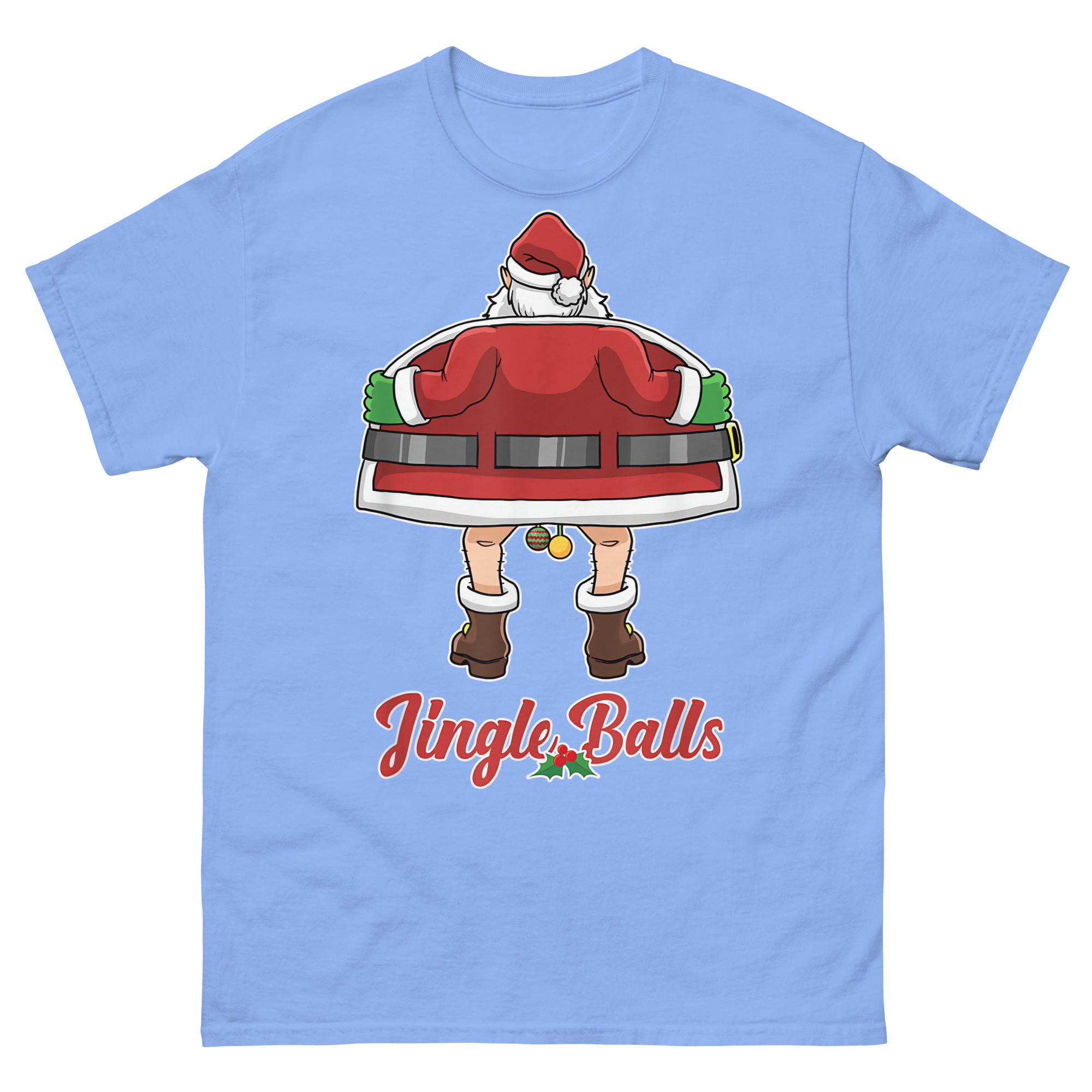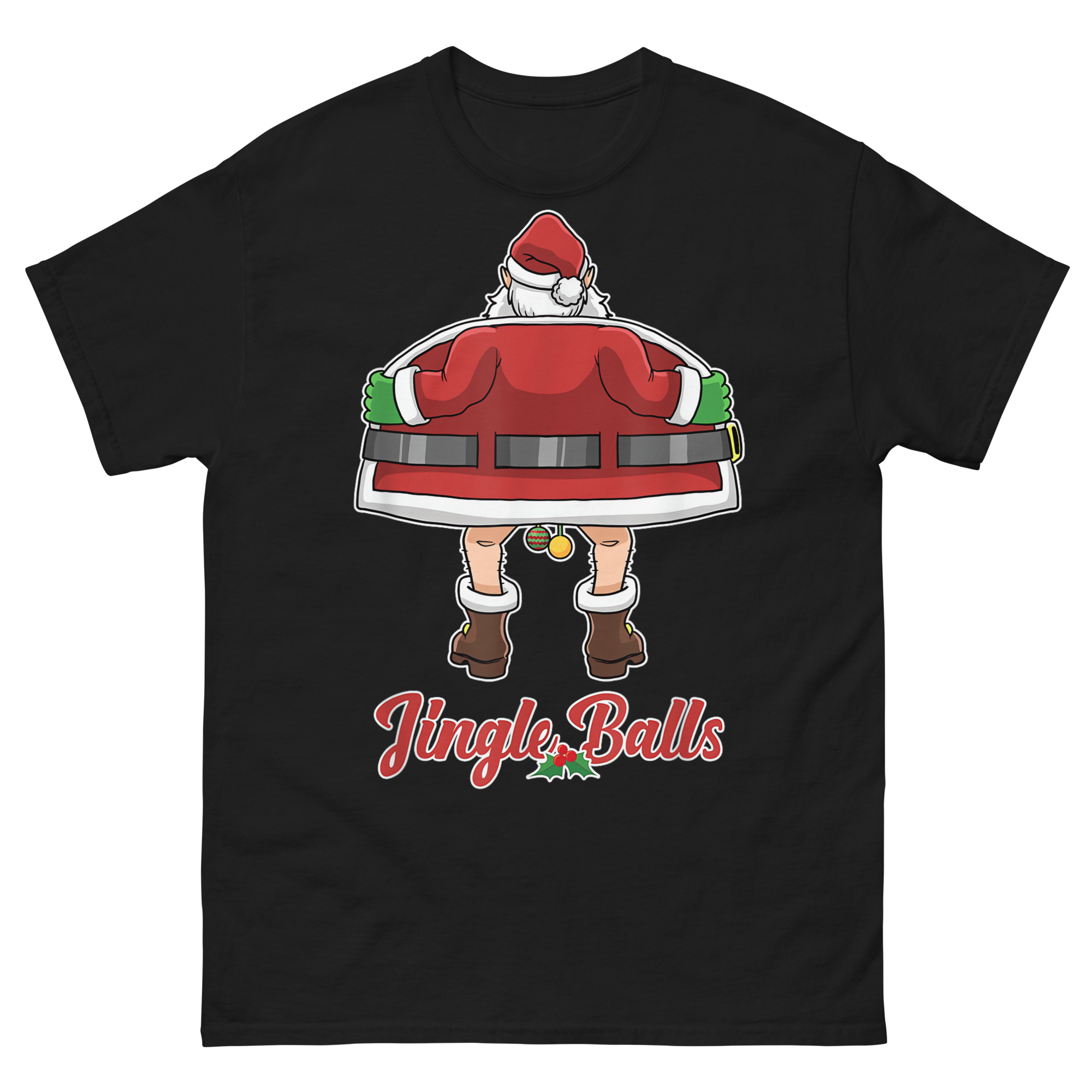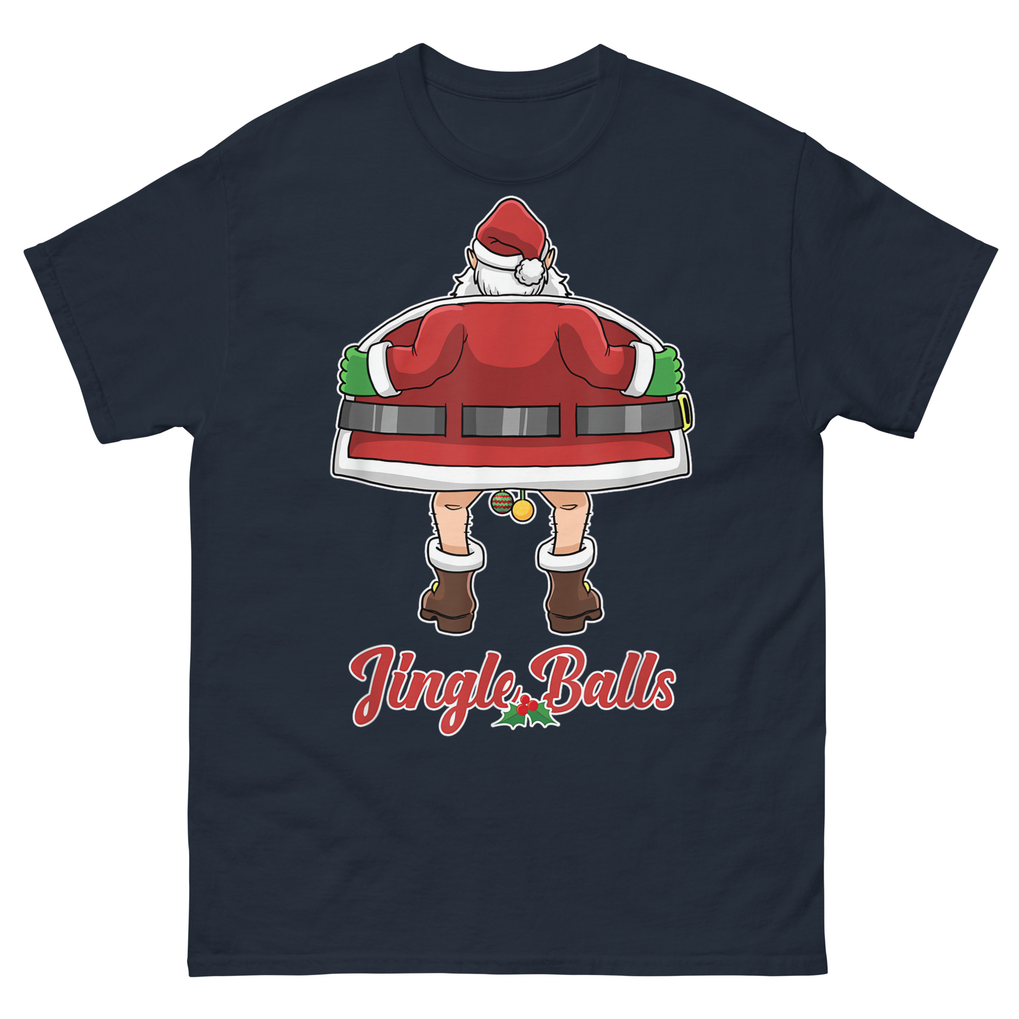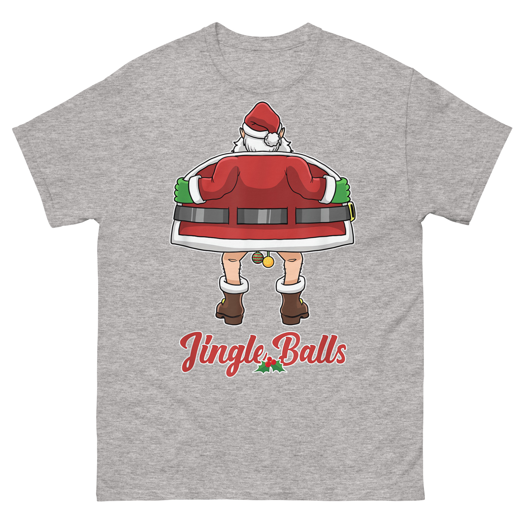 T-shirt dekorerad med ett stort julmotiv med en jultomte som visar kulorna och texten ’Jingle balls’ som dekoration på framsidan. Passar alla män och kvinnor som älskar udda jultröjor. Du kan välja mellan 13 olika färger.