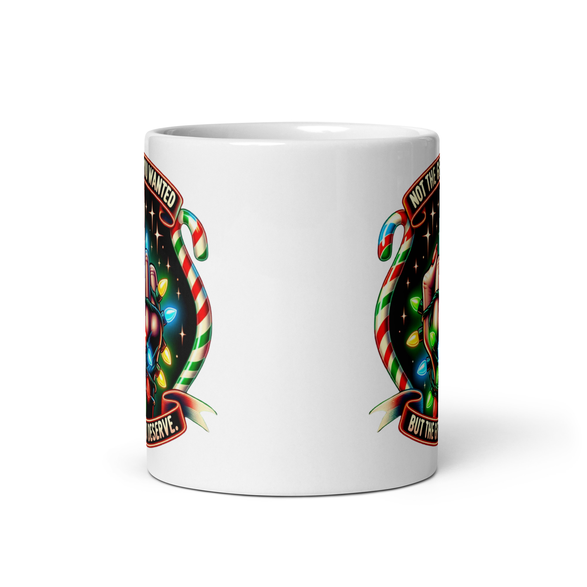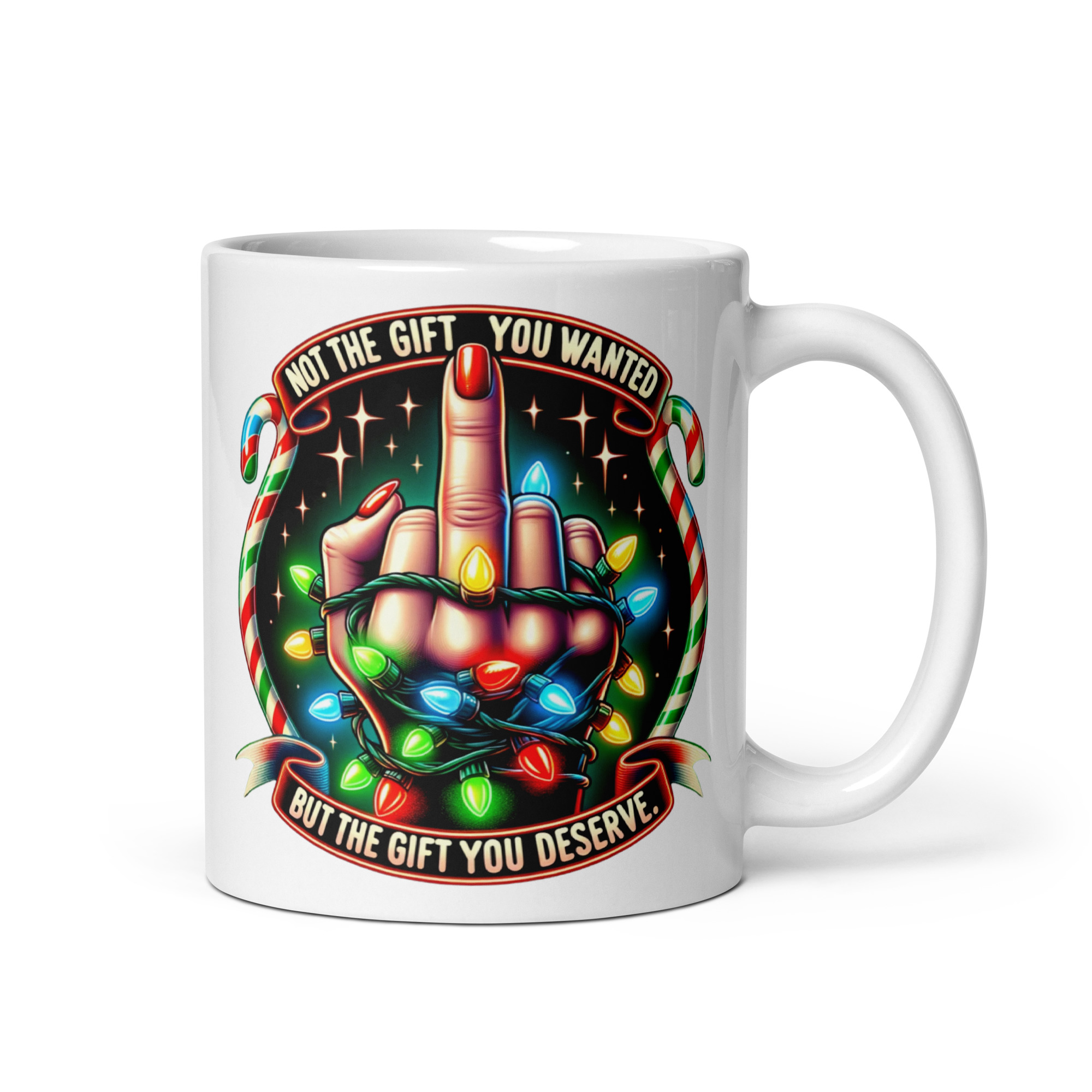 Mugg tillverkad i vit glansig keramik med ett stort julmotiv med en hand som visar långfingret och texten ’Not the gift you wanted, but the gift you deserve’ som tryck på båda sidorna. Muggen har en höjd på 9,6 cm. Kommer bli en perfekt julklapp till personen som förtjänar ett långfinger.