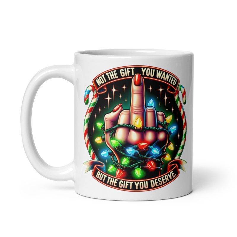 Snygg mugg med ett stort julmotiv med en hand som visar långfingret och texten ’Not the gift you wanted, but the gift you deserve’ som tryck på båda sidorna. Blir en perfekt julklapp till personen som förtjänar ett långfinger.