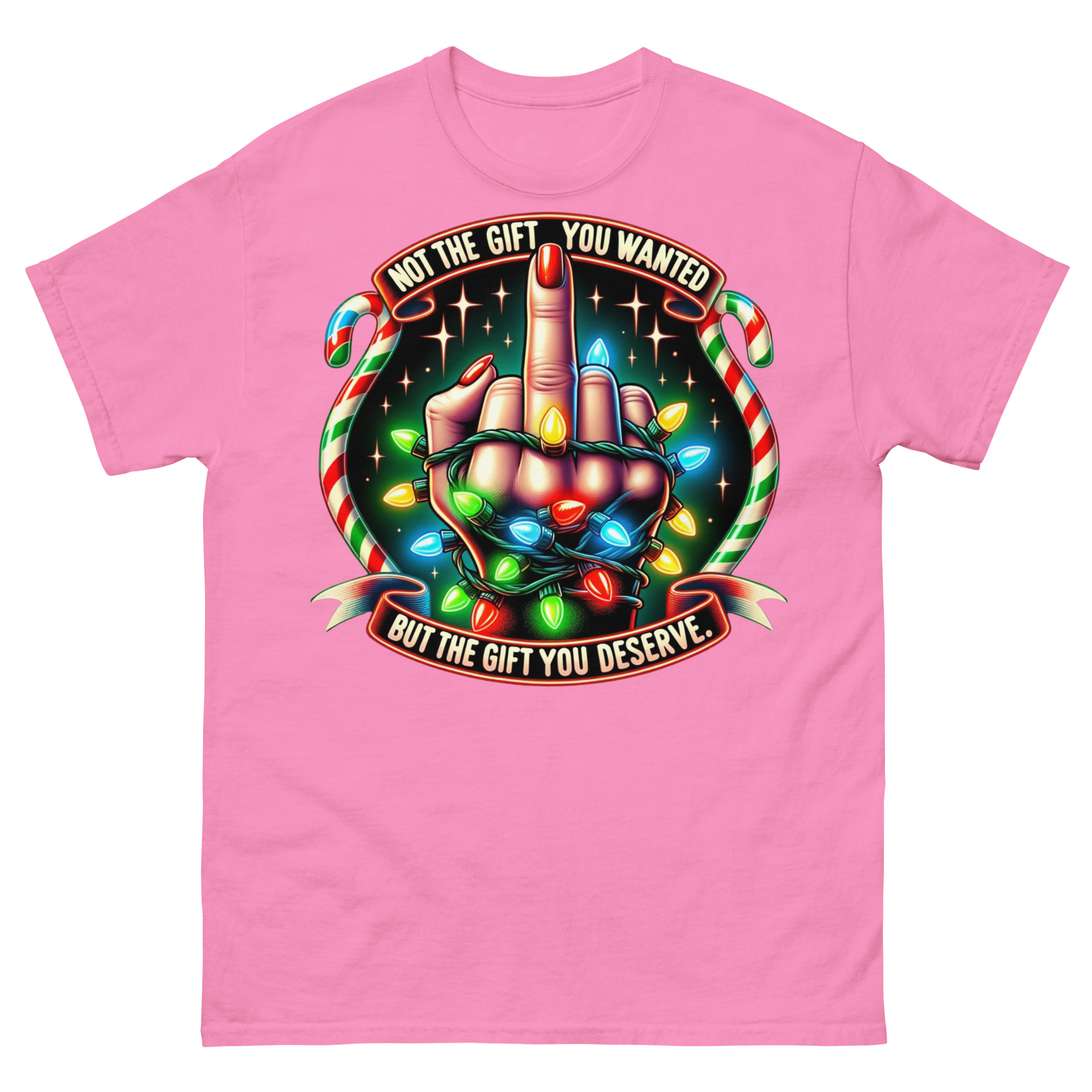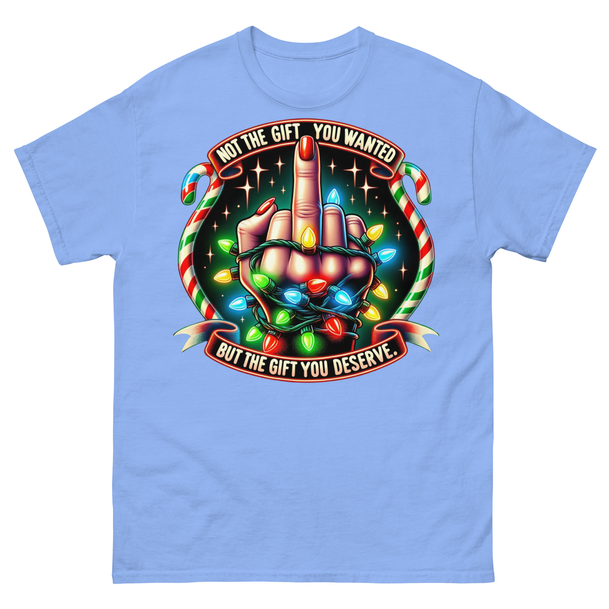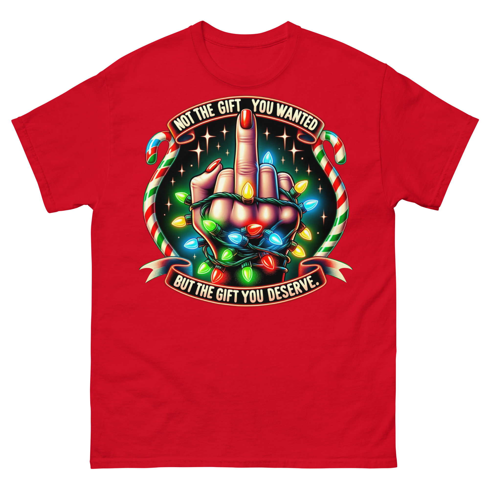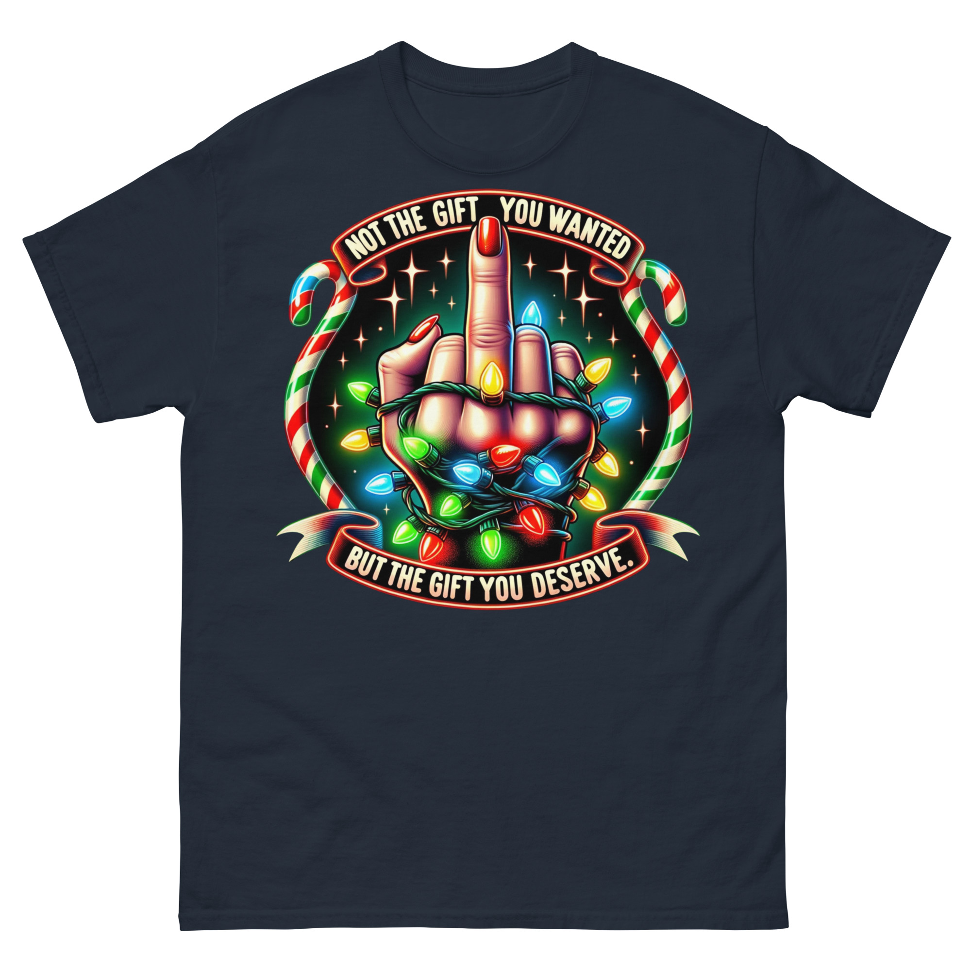 T-shirt dekorerad med ett stort julmotiv med en hand som visar långfingret och texten ’Not the gift you wanted, but the gift you deserve’ som dekoration på framsidan. Passar alla män och kvinnor som älskar udda jultröjor. Du kan välja mellan 12 olika färger.