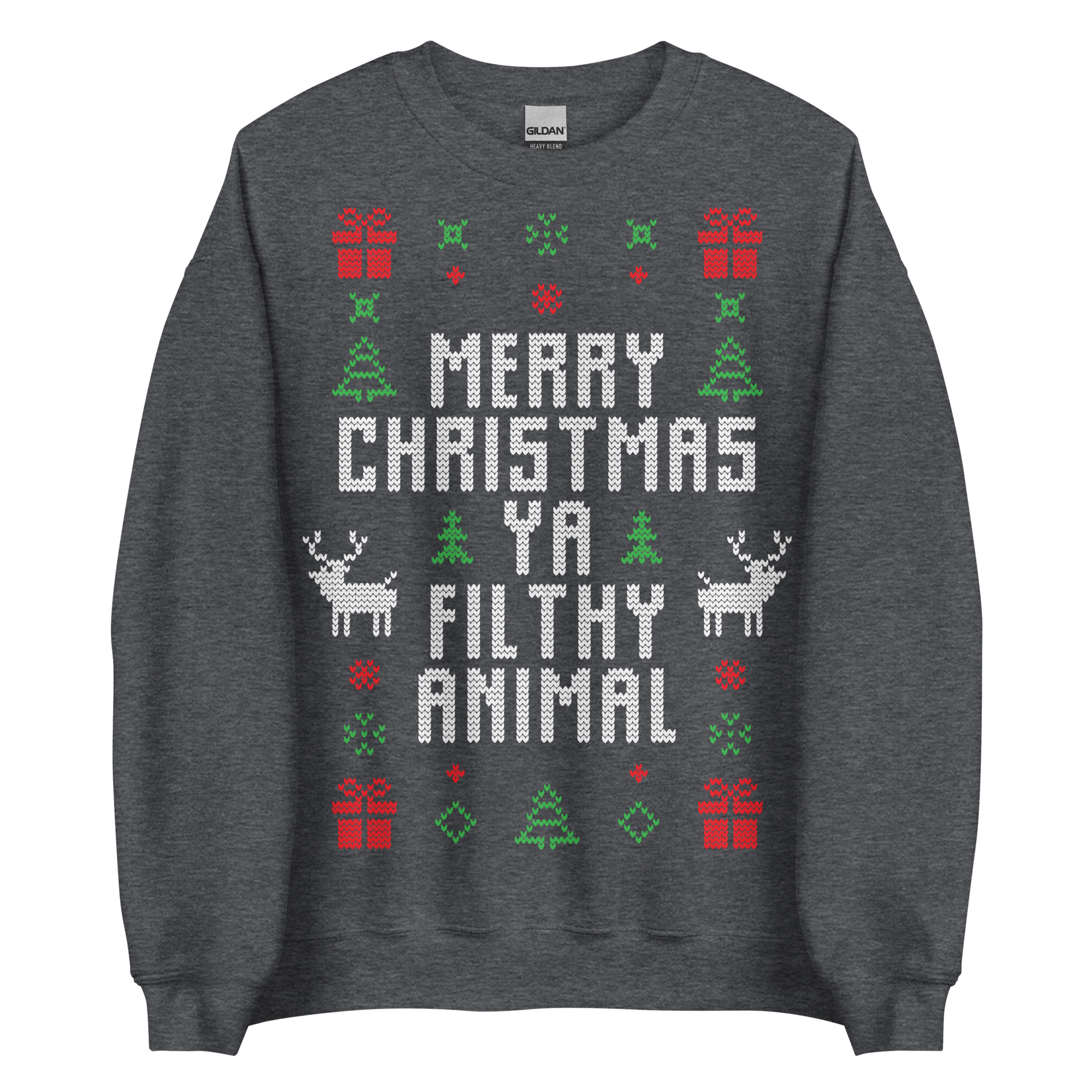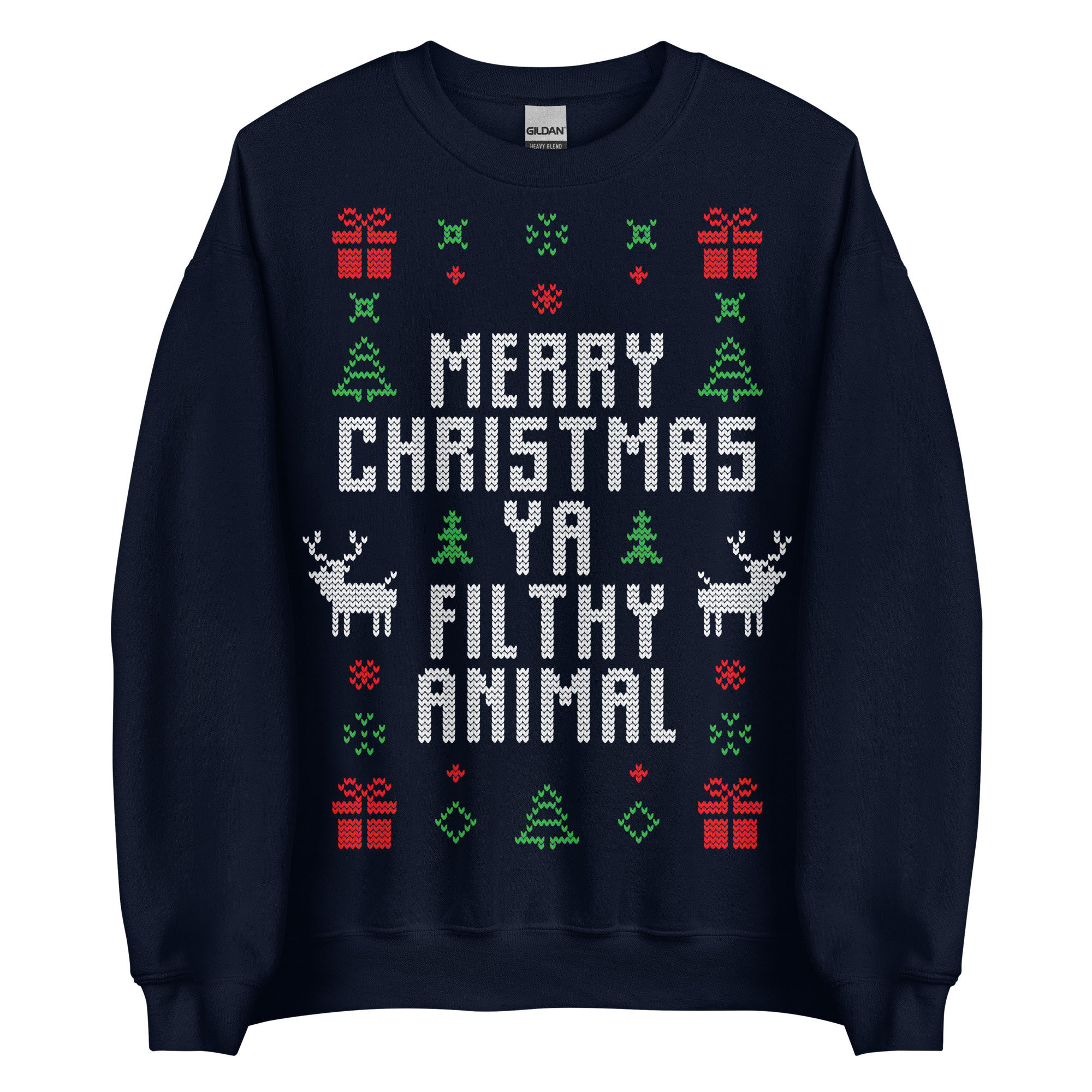 Jultröja dekorerad med ett stort julmotiv med texten ’Merry christmas ya filthy animal’ som tryck på framsidan. Passar perfekt till alla som älskar roliga och udda jultröjor. Välj mellan tre olika färger.